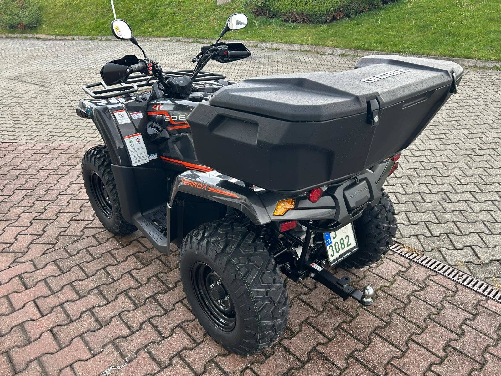 Homologované tažné zařízení je prirozenou součástí pracovního zařazení Terroxu. Je odnímatelné, což umožňuje v případě potřeby připojit jiný typ pracovního zařízení, příklad je sběrný koš na ovoce. a.