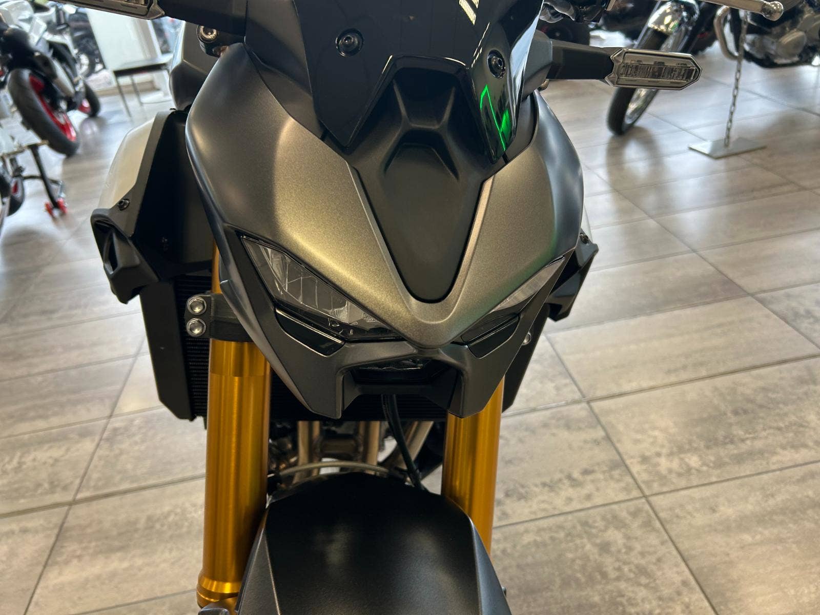 Obrácená přední vidlice o průměru 41 mm nabízí jisté a klidné ovládání ve všech jízdních situacích od města až po horské silnice. Velmi kvalitní vidlice nabízí kromě plynule nastavitelného předpětí možnost nastavení komprese a tlumení odskoku, což umožňuje přesné nastavení podle preferencí každého jezdce a stylu jízdy a nabízí lepší schopnost absorbovat nerovnosti. Vnější trubky vidlice ve zlaté barvě ladí se zadním centrální tlumičem Öhlins S46.