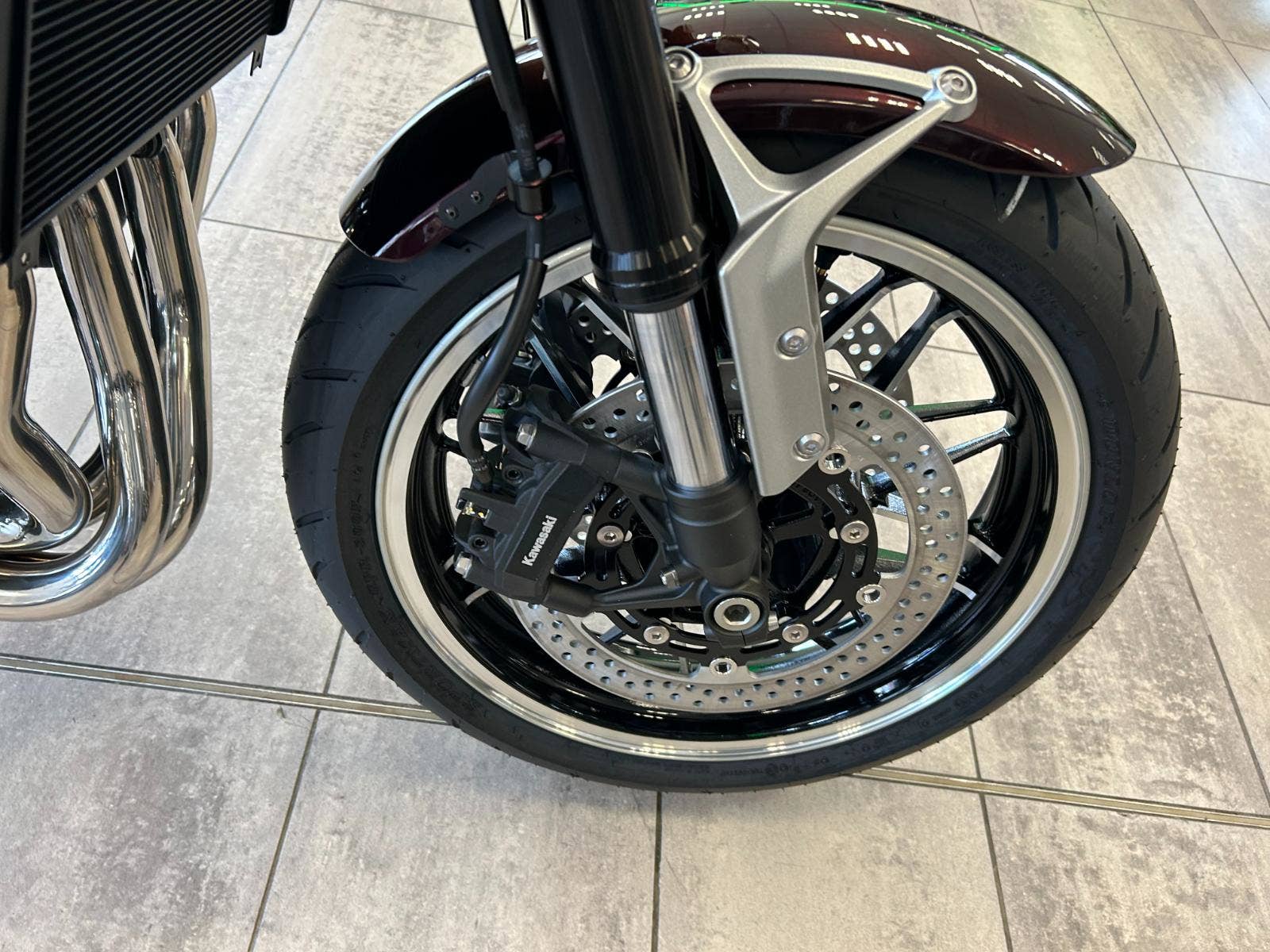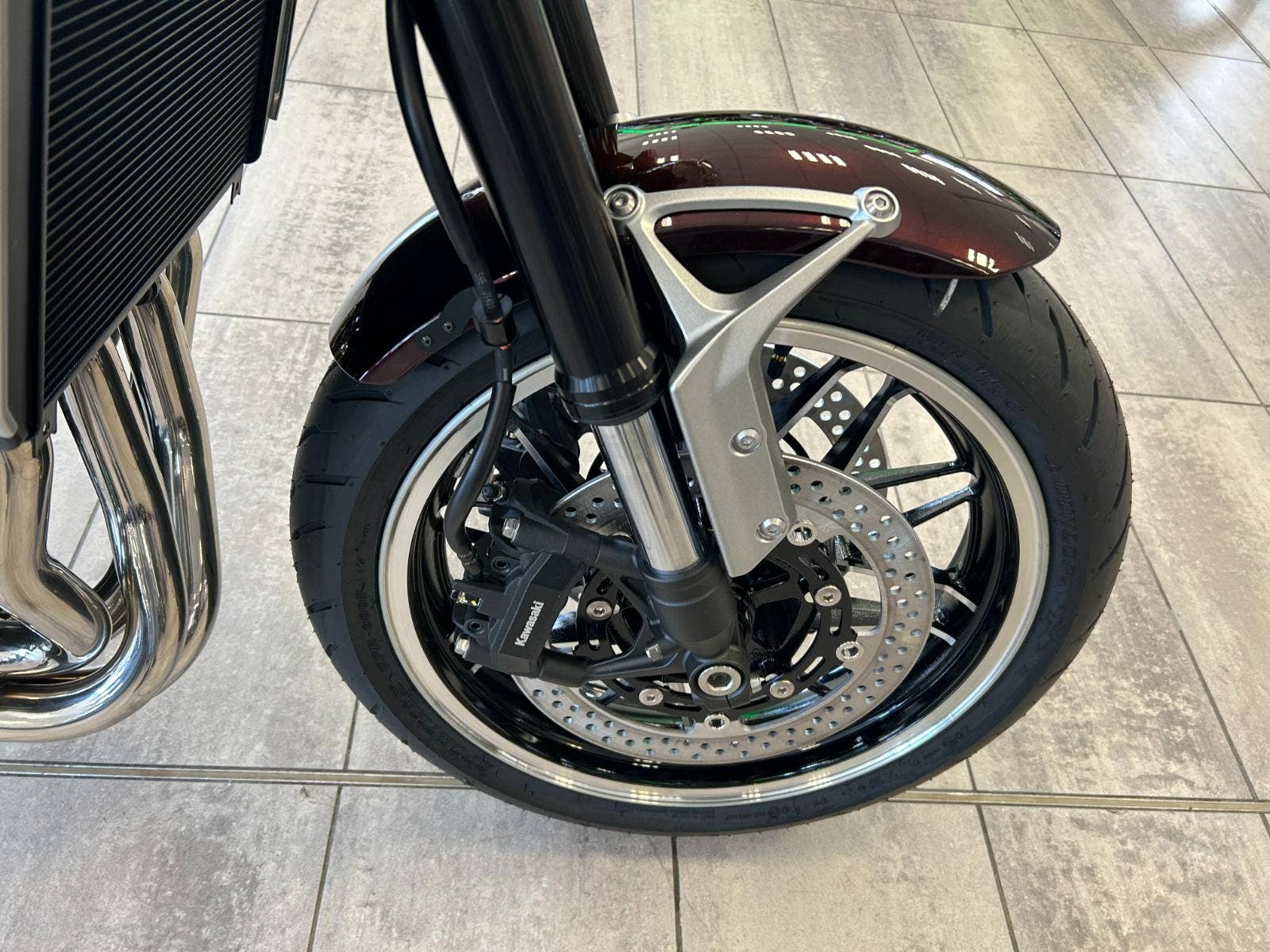 Přední brzdové třmeny, destičky i kotouče o průměru 300 mm jsou dodané od prémiové značky Brembo. Radiální monoblokové brzdové třmeny Brembo M4.32, skvěle doplňuje radiální brzdová pumpa Nissin o průměru 17,5 mm respektive 19,1 mm u standardního modelu. Nerezem opletené pancéřové hadice poskytují větší brzdnou sílu a nabízí lineární nástup při ovládání brzdové páčky, což usnadňuje přesné ovládání přední brzdy.